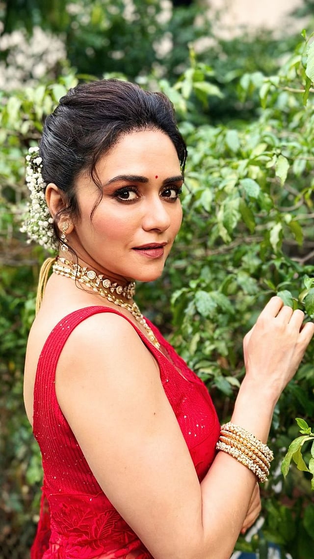अमृताने स्लिवलेज ब्लाऊज स्टाईलवर लाल रंगाची साडी नेसली आहे.