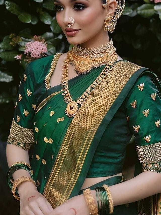 भगवा, गडद निळा किंवा हिरवा रंग ब्लाऊजवर सोनेरी आरी वर्क उत्तम दिसतो.