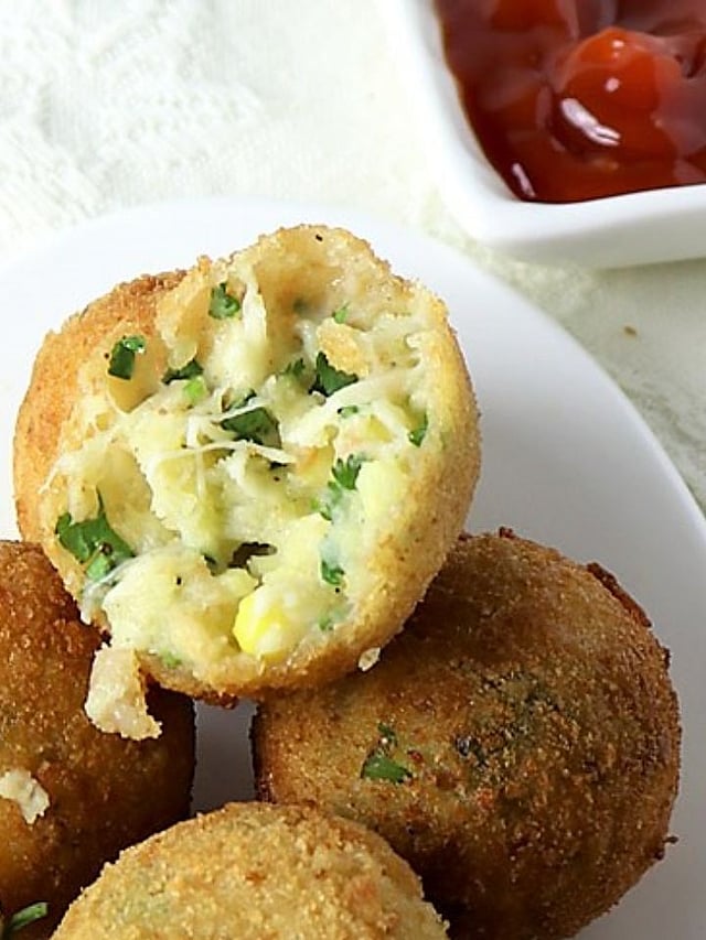 तयार केलेल्या मिश्रणाचे लहान गोळे करुन घ्या. प्रत्येक गोळ्याच्या मध्ये थोडे किसलेले चीज भरून पुन्हा गोल आकार द्या.