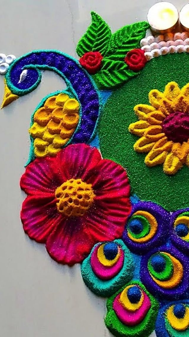 मोराच्या रांगोळी भोवती सुंदर दिवे लावा आणि घर प्रकाशाने उजळवा.