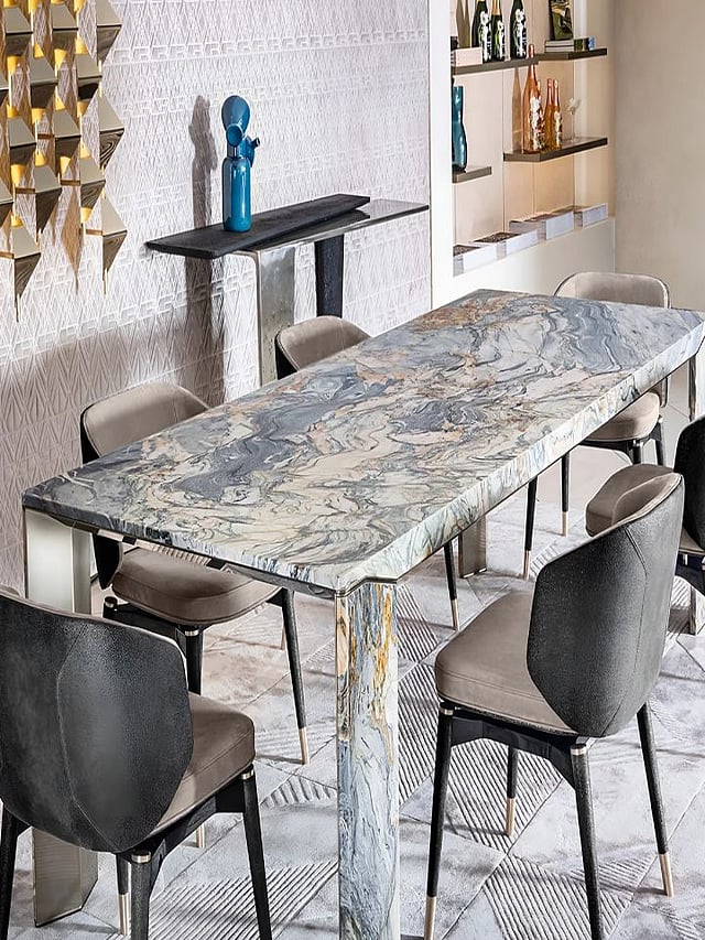 मार्बल टॉप डाइनिंग टेबल घराला लक्झरी लूक देते. हे टेबल मजबूत आणि टिकाऊ आहे. तसेच मार्बल स्वच्छ करायला सोपे असते. मॉडर्न आणि प्रीमियम घरांसाठी हा डाइनिंग टेबल योग्य आहे.