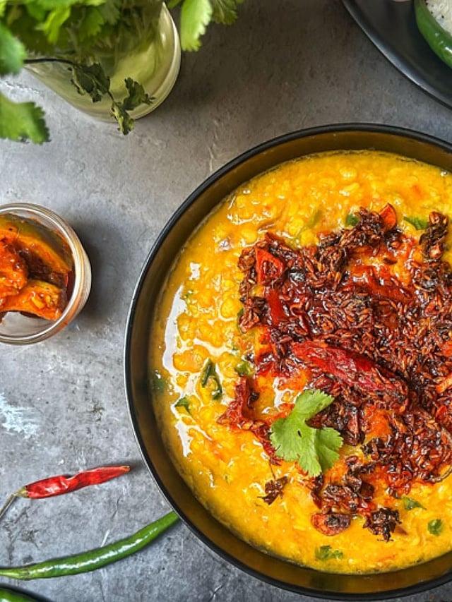 तुम्ही डाळीत लाल मिरचीचा फोडणी देखील देऊ शकता. एका पॅनमध्ये तूप गरम करा, त्यात सुक्या लाल मिरच्या घाला आणि त्या तळून घ्या. नंतर त्यावर डाळ घाला.