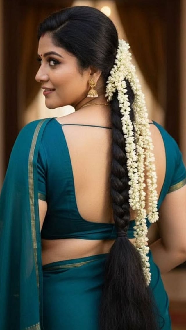 वेणीमध्ये बटांमध्ये तुम्ही गजरा माळायचा आहे. यामध्ये तुम्ही फुले देखील लावू शकता हा एक युनिक आणि सुंदर लूक वाटेल.