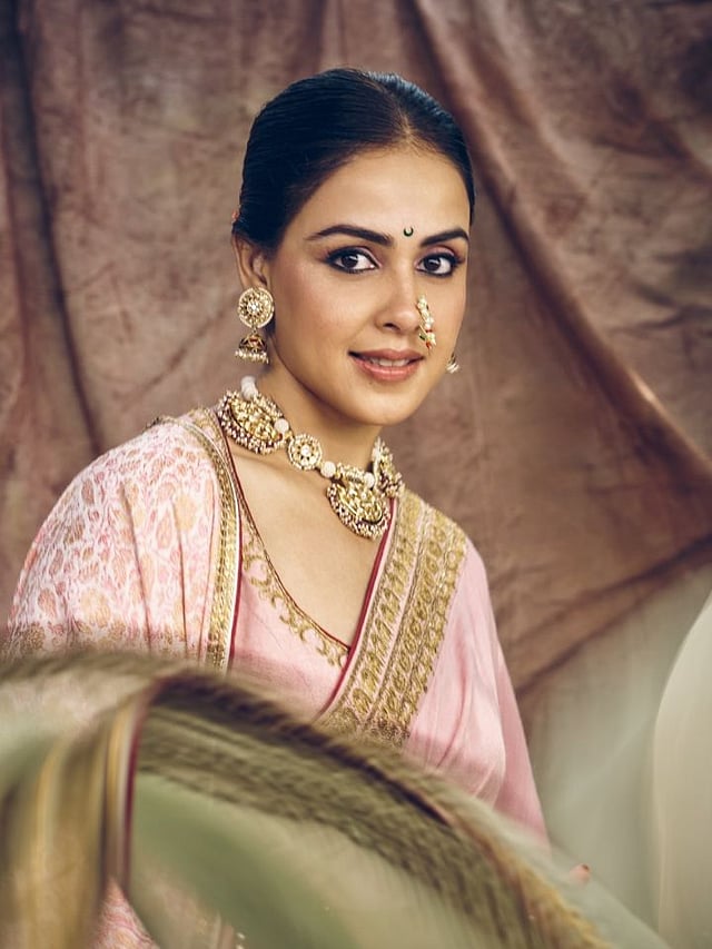 या फोटोशूटसाठी जेनेलियाने पेस्टल रंगाची साडी नेसली आहे. तिने दागिने देखील घातले आहेत.कपाळी टिकली, केसांचा अंबाडा, नाकात नथ असा पारंपारिक साज केला आहे.