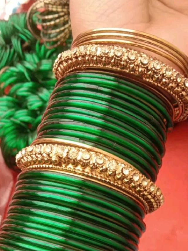 हिरव्या काचेच्या बांगड्यांमध्ये सोनेरी ठसे असलेल्या बांगड्या आकर्षक दिसतात.