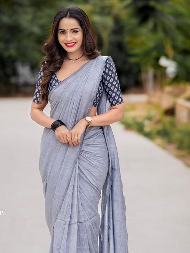 रॉयल ब्लू ब्लाउज ग्रे साडीवर खूपच उठून दिसतो. ऑफिस पार्टी किंवा रिसेप्शनसाठी हा लूक परफेक्ट आहे.