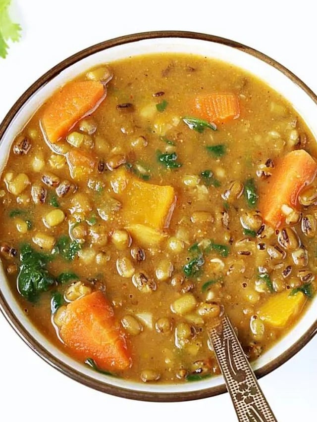 आले, लसूण पाकळ्या, टोमॅटो, गाजर, भोपळ्याचा तुकडा, पालक, सांबार पावडर, पाणी, तेल, लिंबू, काळीमिरी, मिरची, कोथिंबीर, मूग.