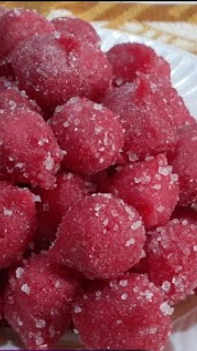 गोळे लाल तळून घ्या आणि पाकात ठेवा. मग पाकातून गोळे काढून त्यावर साखर लावून घ्या.
