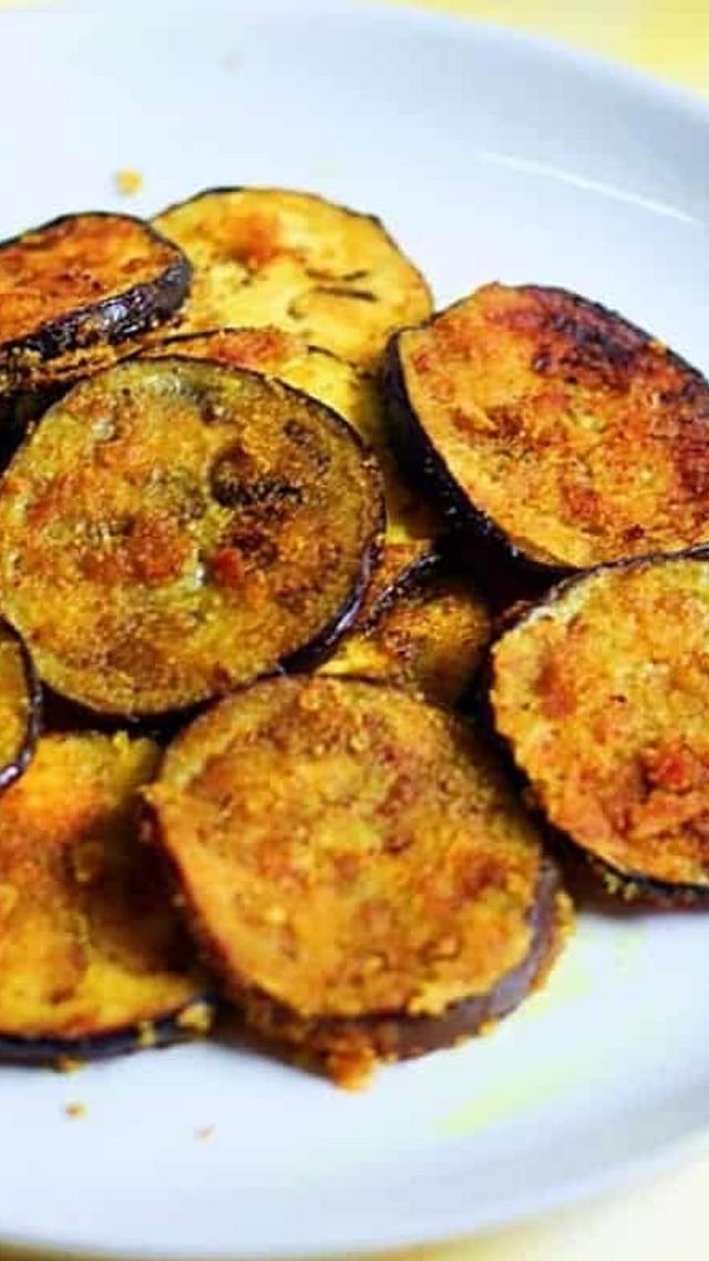 सर्वप्रथम वांगी स्वच्छ धुवून घ्या आणि त्याच्या गोल पातळ चकत्या करून घ्या.