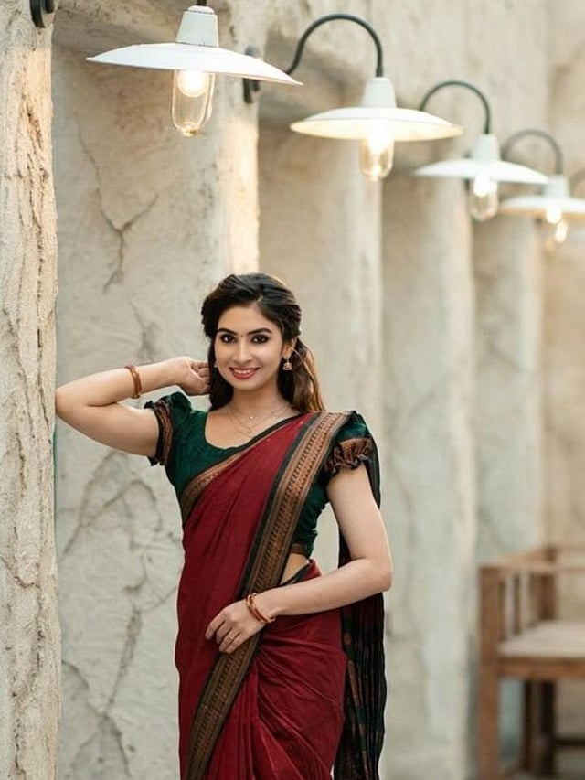 कसूती भरतकाम असलेली इलकल साडी खूप सुंदर दिसते. या पॅटर्नमध्ये साडीवर नाजूक भरतकाम केलेले असते, ज्यामुळे साडी अधिक आकर्षक वाटते.