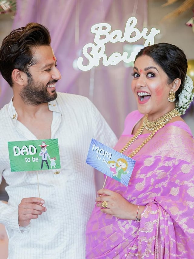 बेबी शॉवर सोहळ्यासाठी तिने गुलाबी रंगाची साडी नेसली होती. यासोबत तिने साऊथ इंडियन स्टाइलचे दागिनेही कॅरी केले होते.