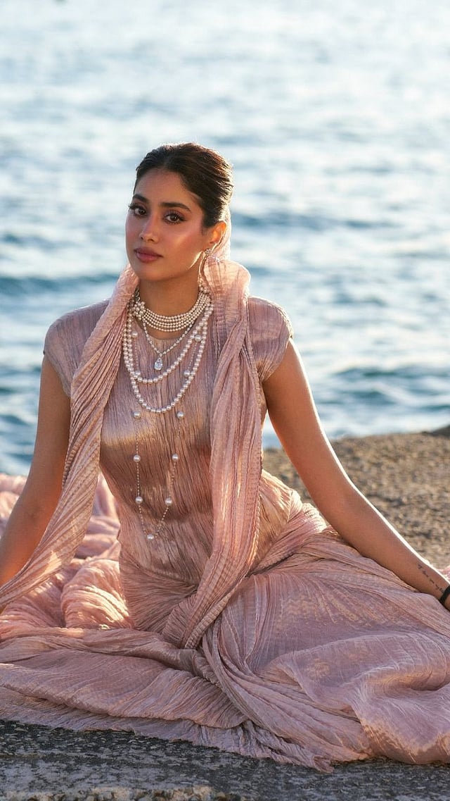 मोत्यांचे दागिने, केसांचा बन आणि ग्लॉसी मेकअपने जान्हवीचे सौंदर्य खुललं आहे.