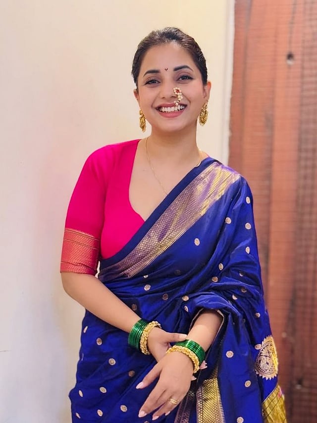 सायली संजीवने छान निळ्या रंगाची पैठणी नेसली आहे.
