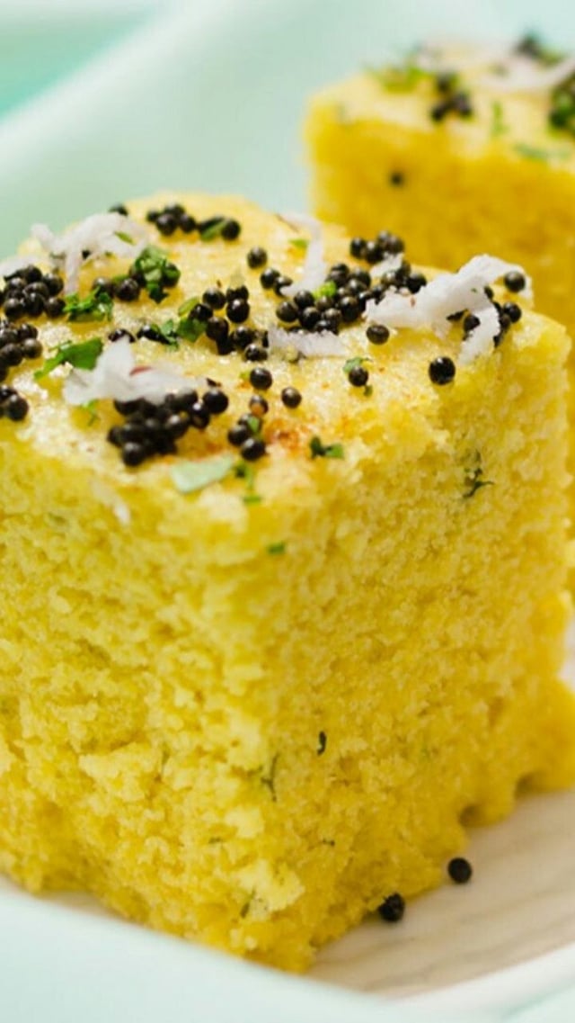 आता ढोकळ्यावर हे मिश्रण आणि कोथिंबीर घालून खमण ढोकळा सर्व्ह करा.