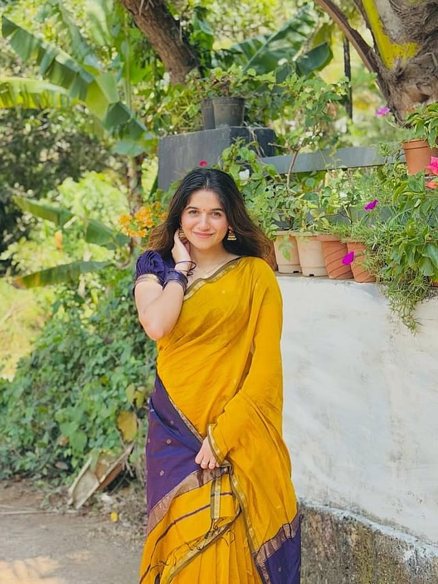 पिवळ्या साडीवर जांभळ्या रंगाचा ब्लाऊज खूप आकर्षक कॉन्ट्रास्ट तयार करतो आणि पारंपरिक लुक देतो.