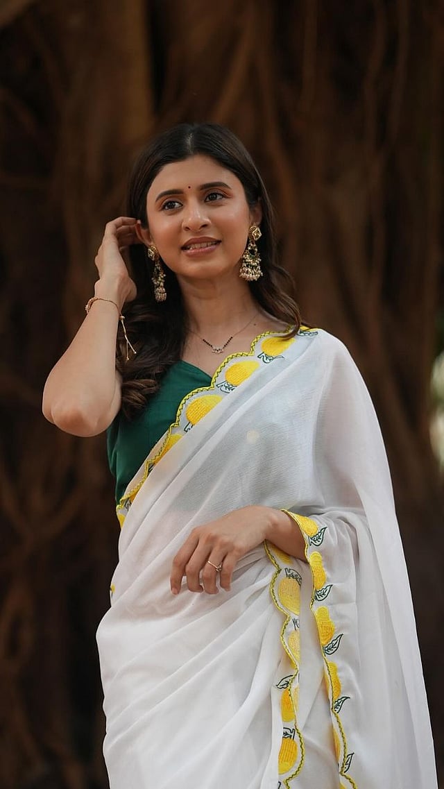 अंकिताने पांढऱ्या रंगाची, पिवळी काठ असलेली साडी नेसली आहे.