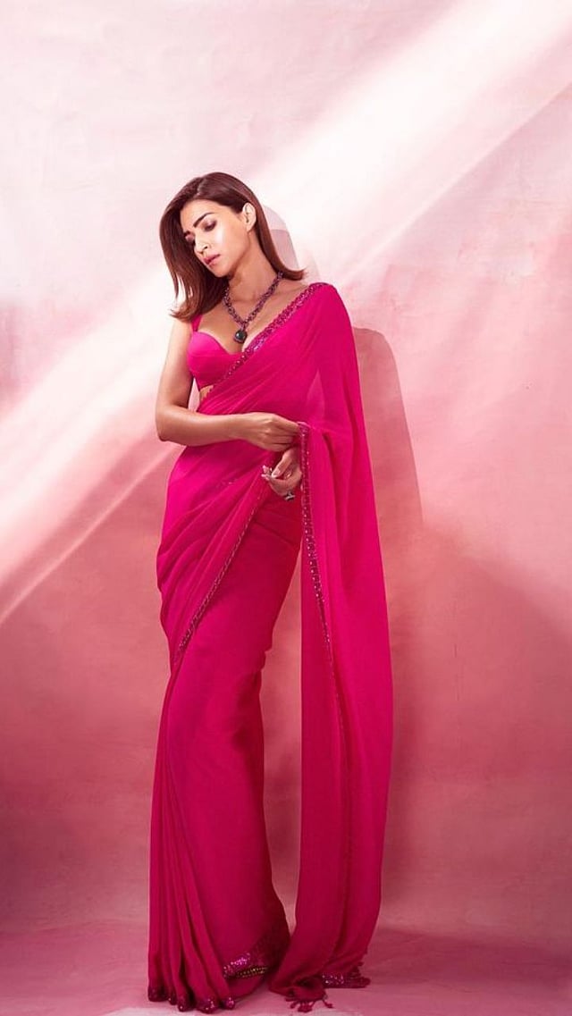 क्रितीने हलक्या गुलाबी साडीत स्लीवलेस ब्लाउजसह स्टायलिश लुक केला आहे.