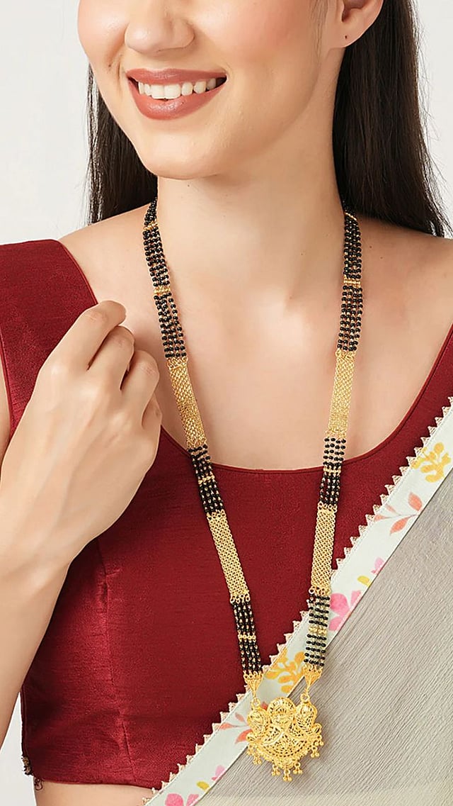 काळ्या मण्यांमध्ये सोन्याचे मोठे पेडंट असलेले हे मंगळसूत्र आहे. नवीन डिझाईनचे हे मंगळसूत्र शोभून दिसेल