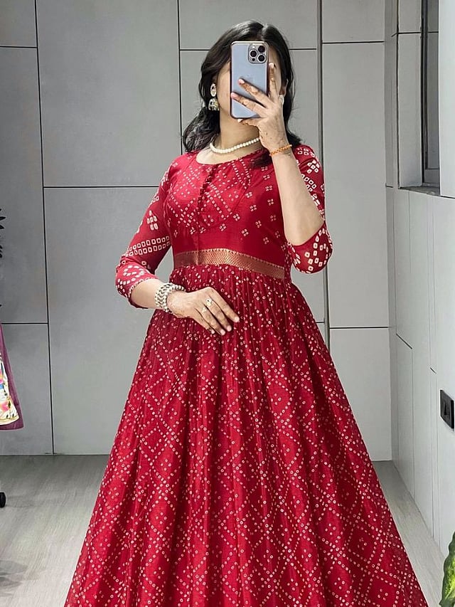सणासुदीसाठी अॅनारकली पॅटर्नमध्ये बांधणी ड्रेस बेस्ट पर्याय ठरतो. फ्लोअर आणि पारंपरिक प्रिंटमुळे हा लूक रॉयल आणि एलिगंट दिसतो.