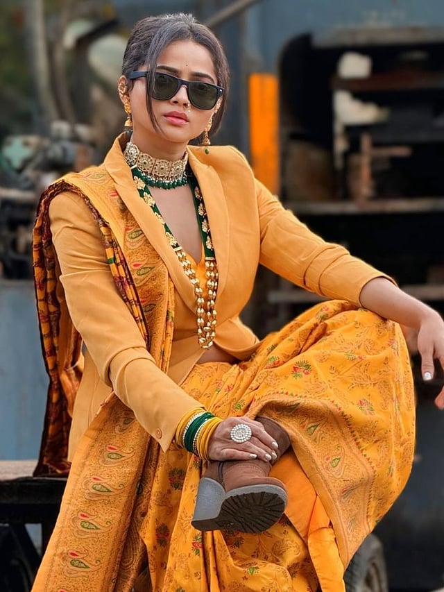 शिवालीने गडद पिवळ्या रंगाची साडी नेसली आहे. त्यावर मॅचिंग ब्लाऊज परिधान केला आहे. तसेच साडीवर ब्लेझर घालून तिने डॅशिंग लूक केला आहे.