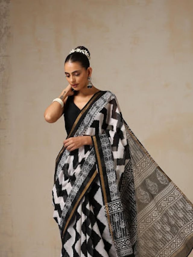 तुम्ही कॉटनची साधी ब्लॅक साडी घालून त्यावर मिसमॅच म्हणजे पिवळा रंगाचा ब्लाऊजवर घालू शकता. संक्रांतीसाठी हा लूक पारंपरिकही वाटतो आणि ऑफिससाठी योग्यही ठरतो.