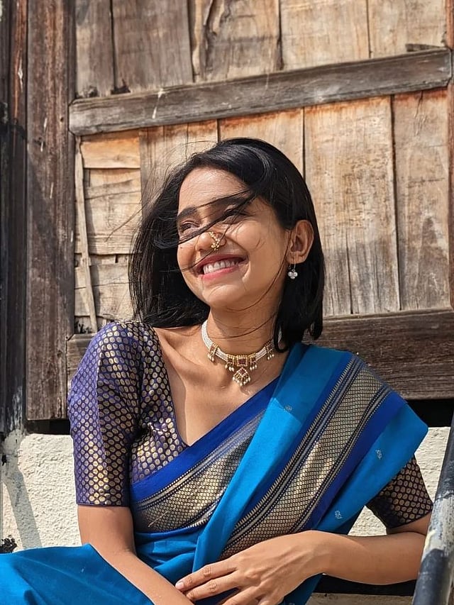 भाग्यश्रीने नव्या फोटोमध्ये निळ्या रंगाची साडी परिधान केली आहे.