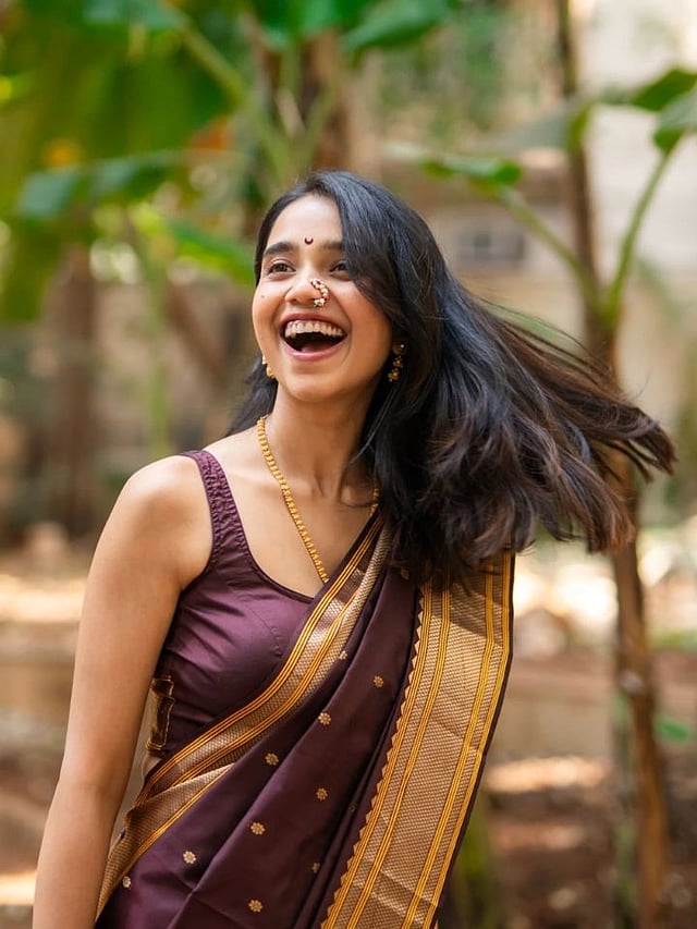 अक्षय्य तृतीयेच्या निमित्ताने भाग्यश्री लिमयेने वाईन रंगाची साडी परिधान करत पारंपरिक आणि एलिगंट लूक साकारला.