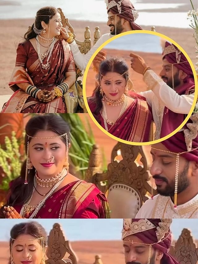 मेकअप, नाजूक दागिने आणि सौंदर्यावरचं हास्य हे सारं काही सांगून जात आहे. यातच लक्ष वेधून घेत आहे ते म्हणजे तिने घातलेलं मंगळसूत्र.