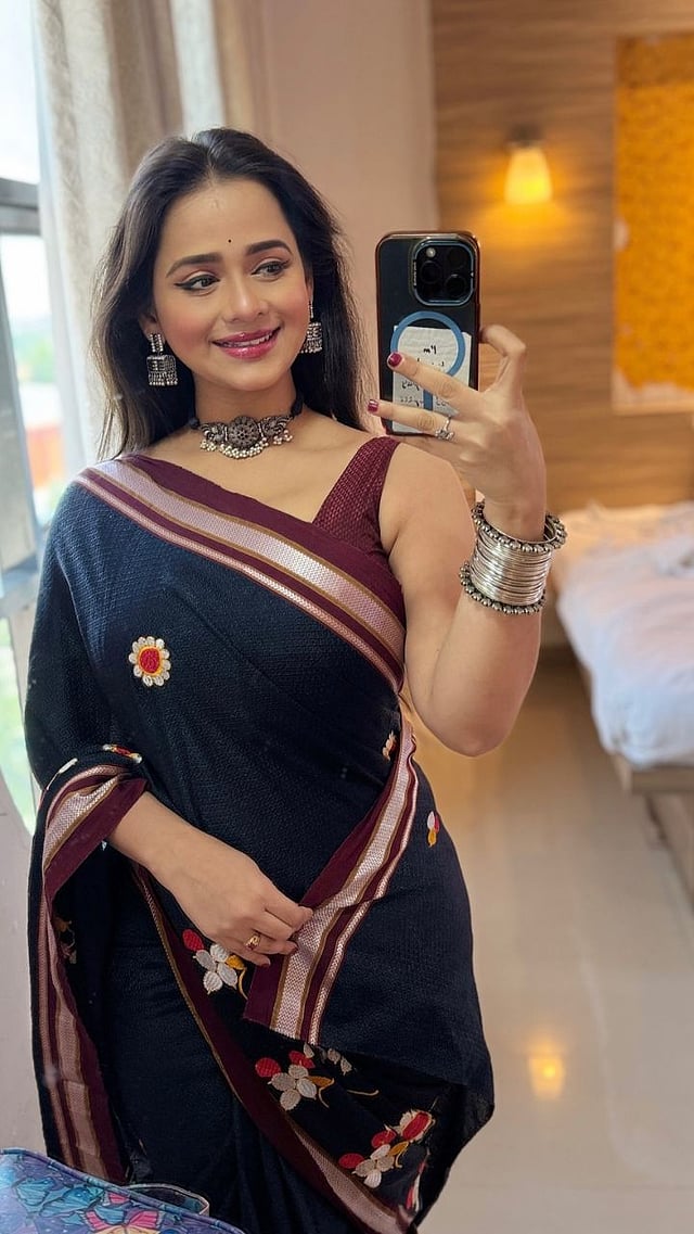 काळ्या साडीत मधुराच सौंदर्य खुलून आलं. एकदम स्टायलिश पोजमध्ये मधुराने सेल्फी काढला आहे.