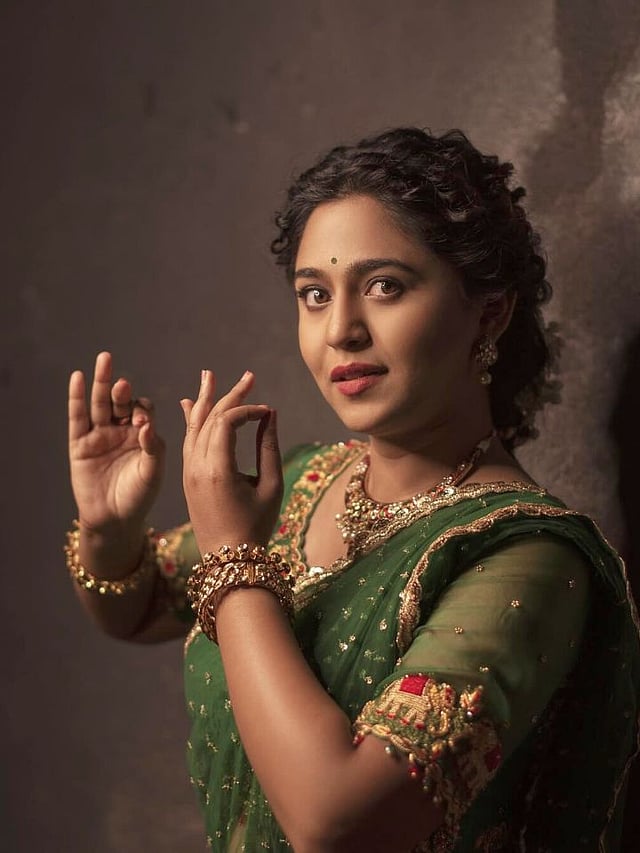 मृण्मयी देशपांडेने हिरव्या आणि नारंगी रंगाची घागरा- चोळी परिधान केली आहे.
