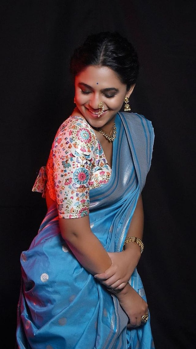 निळ्या साडीत साजेसा मेकअपमध्ये मृण्मयीची अदा पाहून चाहते वेडेपिसे झाले आहेत.