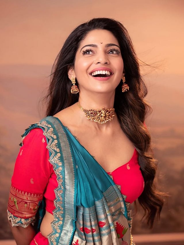 पूजा सावंतने छान पिंक घागरा घातला आहे. त्यावर निळ्या रंगाची बनारसी ओढणी घेतली आहे.
