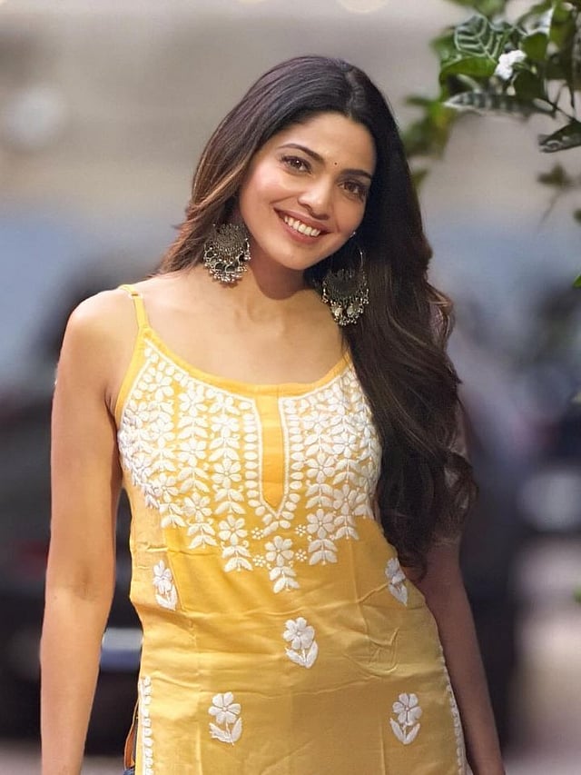 पूजा सावंतने पिवळ्या रंगाचा चिकनकारी कुर्ता घातला आहे.