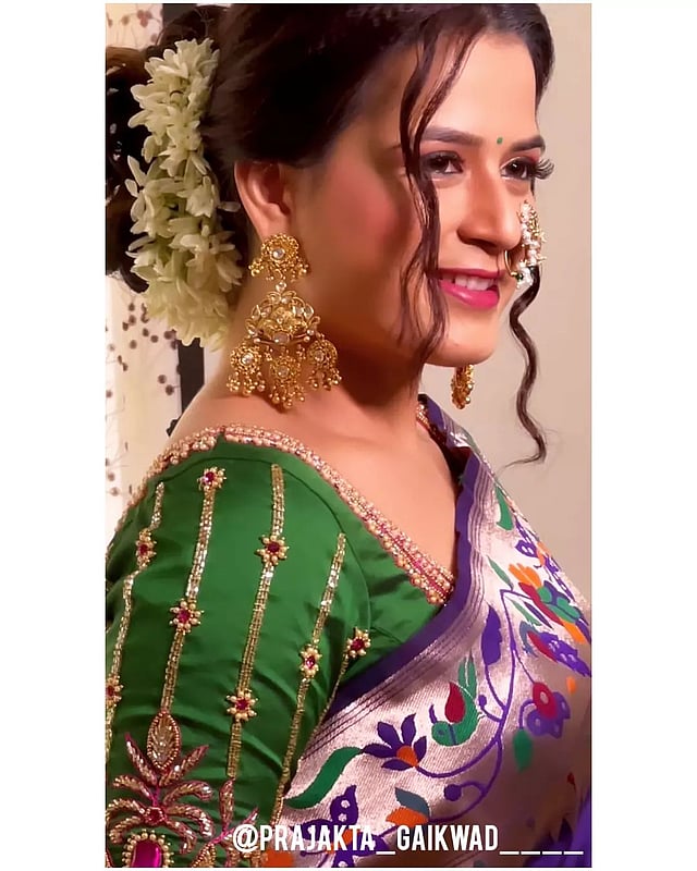काठाची साडी , नाकात नथ असा प्राजक्ताने मराठमोळा साज केला आहे.