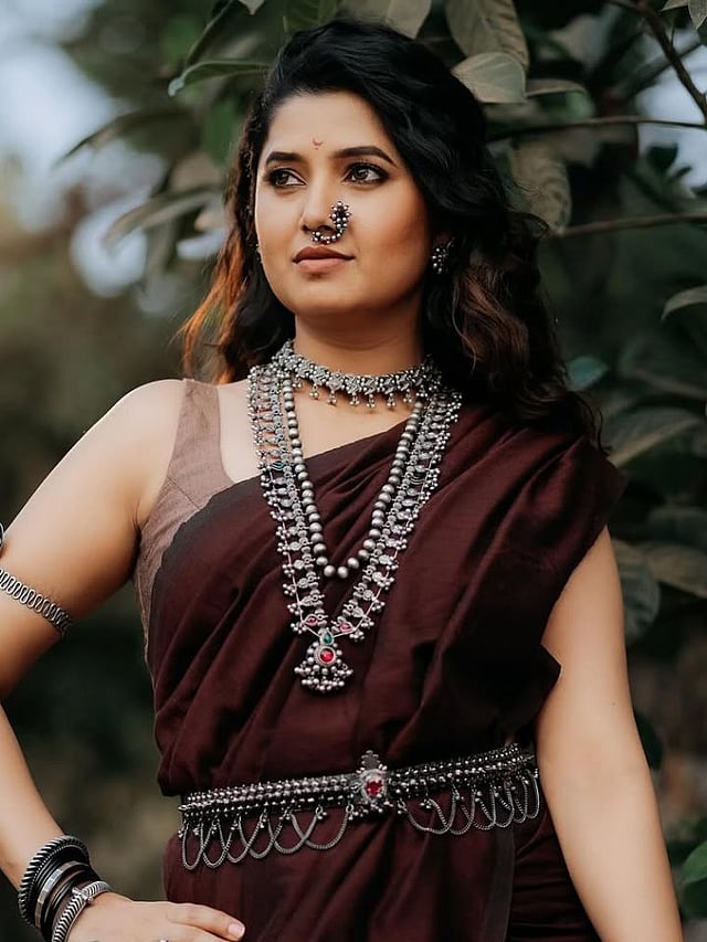 या साडीवर तिने कोल्हापूरी साज घातला असून त्यावर नथ घातली आहे.