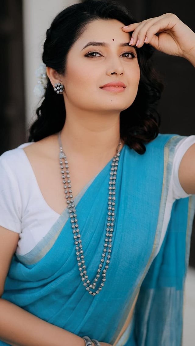 तिने आकाशी रंगाची सुंदर साडी नेसली आहे.