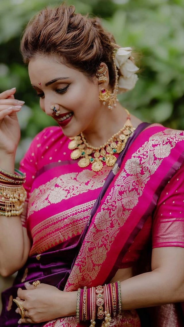 जांभळ्या रंगाच्या नऊवारी साडीत रूपालीचं सौंदर्य खुलून दिसतय.