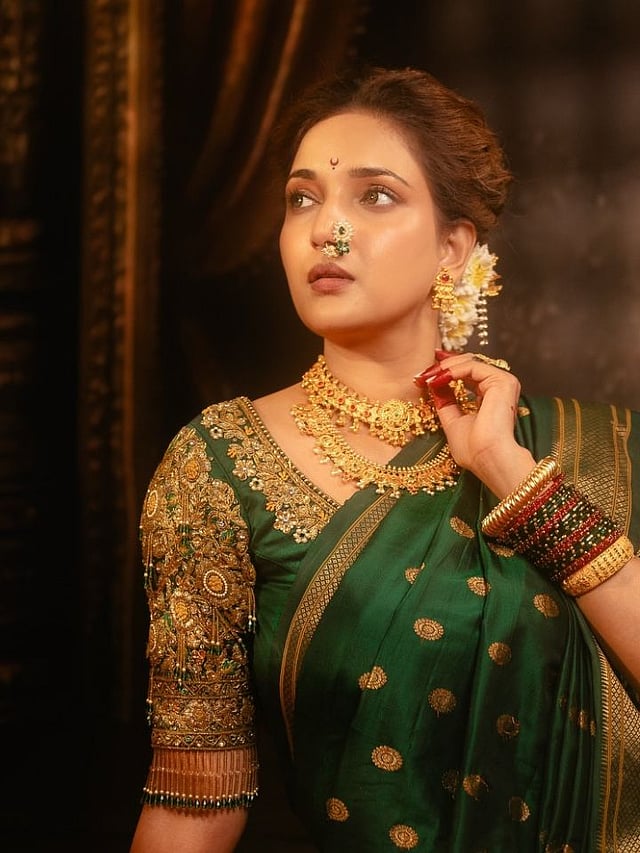 नाकात नथ आणि केसांचा अंबाडा तिने घातला आहे. तिचं सौंदर्य खुपच सुंदर दिसत आहे.