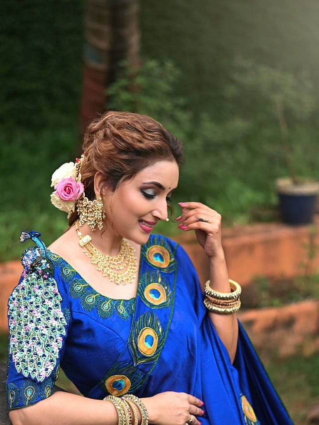 निळ्या रंगाची साडी परिधान करून रूपालीने खास लक्ष वेधून घेतलं आहे.