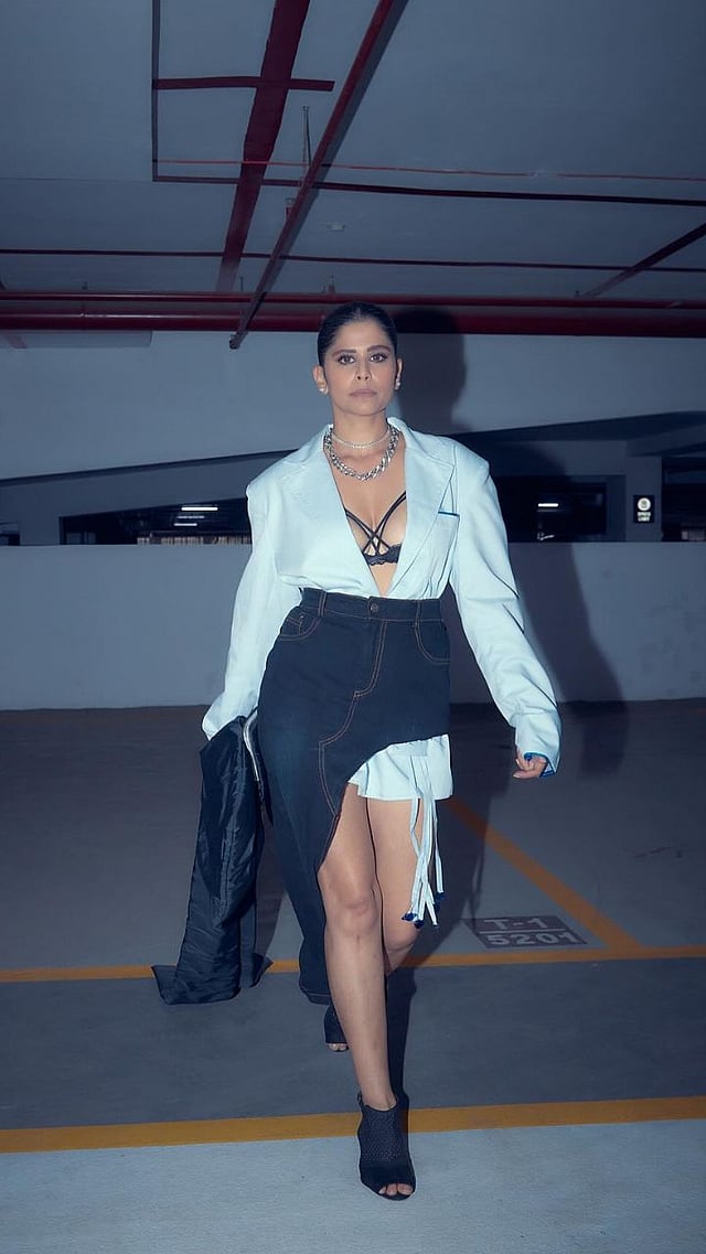अभिनेत्री सईने डेनिम क्रॉस स्लिट स्कर्टसह पांढरा शर्ट स्टाईल केला आहे.