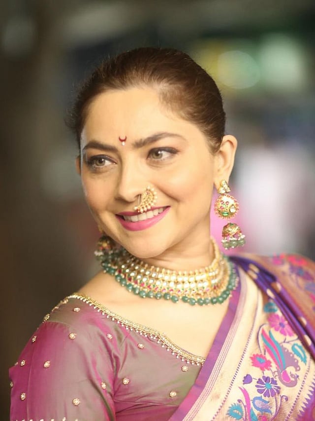 तसेच केसांचा सुंदर खोपा खातला आहे. सोनालीच्या ब्लाउजवर देखील सुंदर नक्षी आहेत.