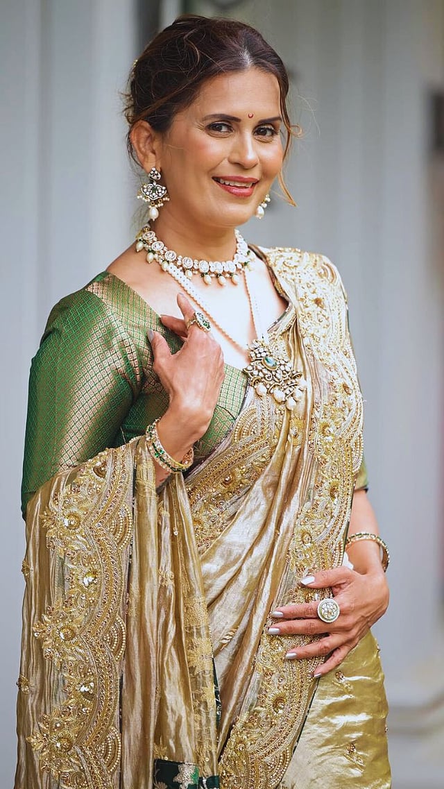 सोनालीने साडीला मॅचिंग गोल्डन आणि मोत्यांची ज्वेलरी घातली आहे.