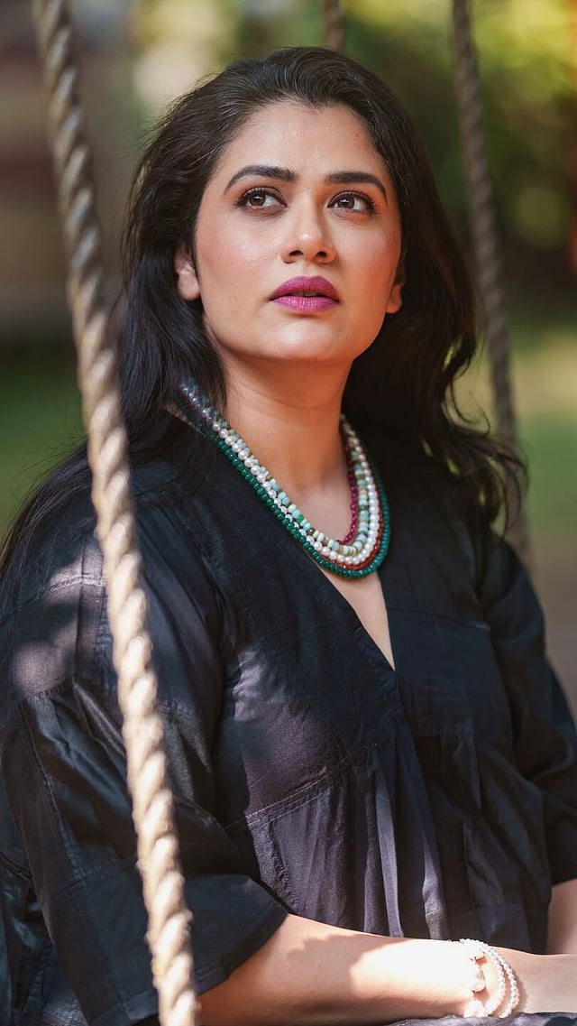 गिरिजा ओकने ब्लॅक कलरचा ड्रेस घातला आहे. त्यावर मल्टीकलर मोत्यांचा हार घातला आहे.