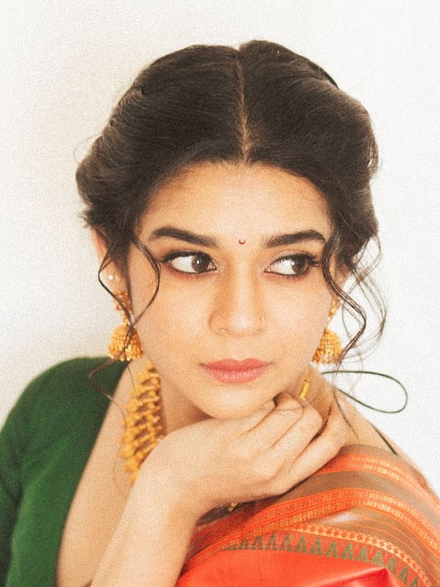 मिथिलाने मराठमोळ्या लूकला साजेशी केसांची हेअरस्टाईल केली आहे. त्यावर तिने चंद्रकोर टिकली लावली आहे.