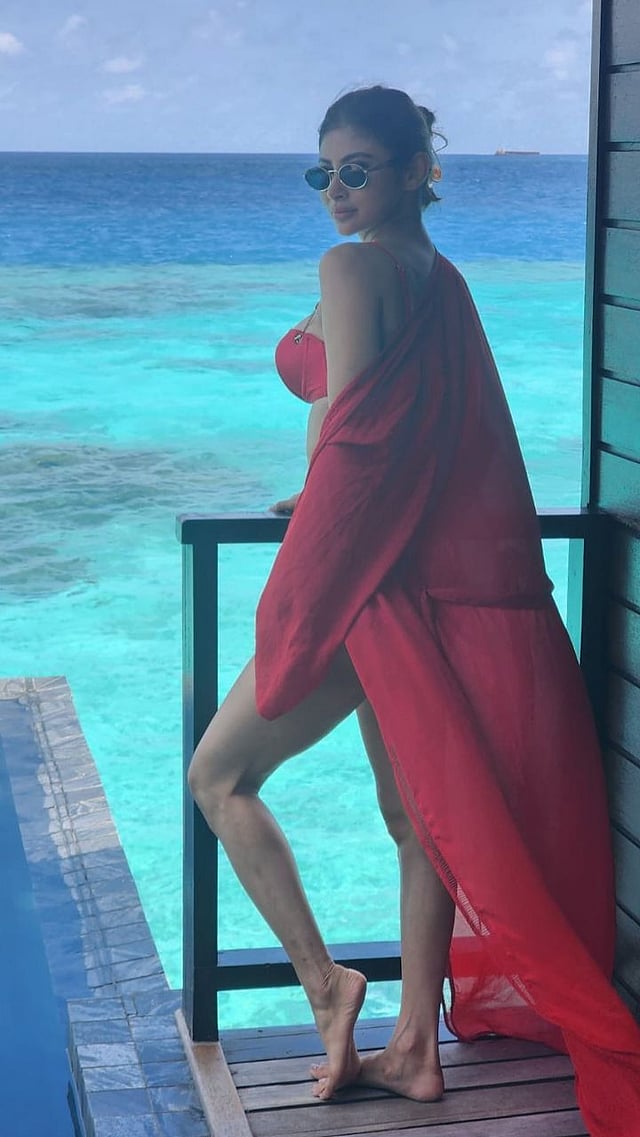 मौनी रेड आऊटफिटमधले बीचवरील फोटो पोस्ट केले आहेत.