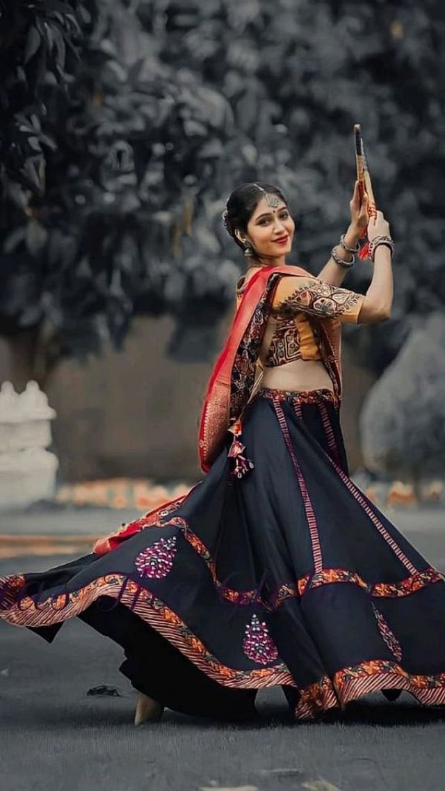 लेहेंगा-चोली हे नवरात्रीचे आकर्षण आहे. यावरील नक्षीकाम भन्नाट असते.