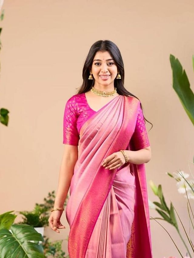 गुलाबी रंगातील बनारसी साडी ही पारंपरिक आणि राजेशाही लूकसाठी उत्तम पर्याय आहे.