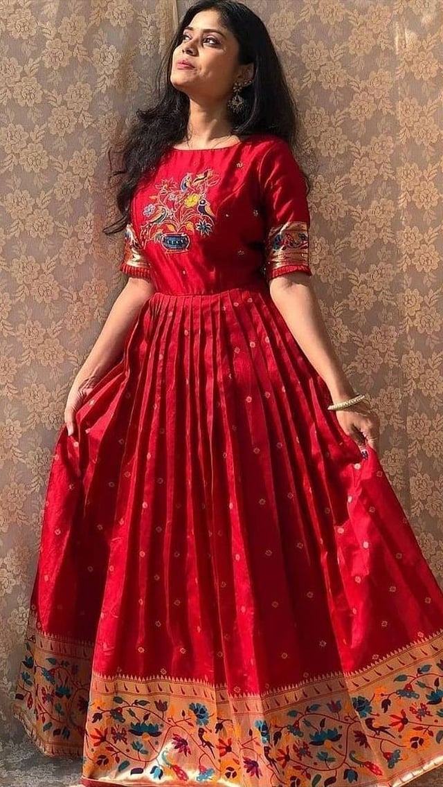 अनारकली ड्रेस शिवायचा असल्यास तुम्ही जुनी सिल्क किंवा काठपदराची साडी निवडू शकता. हा लूक भारी दिसेल.