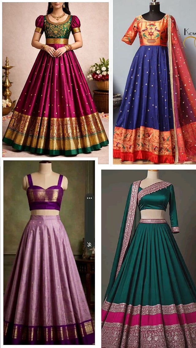 अनेकदा साड्या कितीही जुन्या झाल्या तरी त्या फेकून द्यायचं मन होत नाही अशावेळी तुम्ही जुन्या काठपदरी साड्यांचे सुंदर घागरा ड्रेस शिवू शकता.