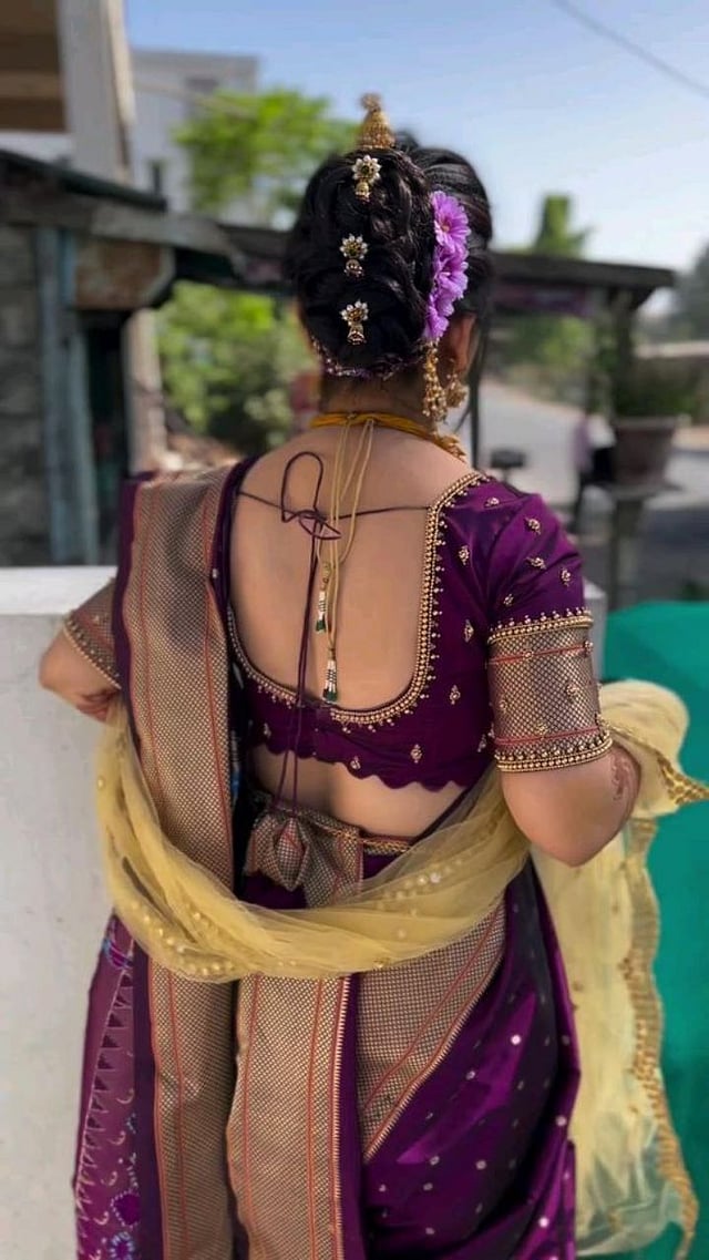 रॉयल पैठणी साडीवर ब्लाउजच्या पाठीमागे मोराची सुंदर डिझाइन करा. त्यामुळे पाठीची शोभा वाढते आणि साडी देखील शोभून दिसते.